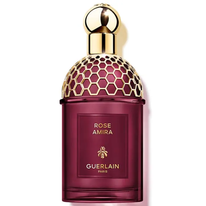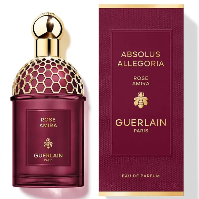 El frasco de Guerlain Absolus AllegoriaRose Amira Eau de Parfum adopta el frasco emblemático de la colección Allegoria, teñido en vidrio de color granate intenso rinde homenaje al mítico frasco de panal de abejas, líneas rectas, curvas y cilíndricas, coronado por su preciosa joya dorada. Ha sido elaborado en Francia y realizado a partir de un 15 % de vidrio reciclado. Su vaporizador desenroscable y su lacado transparente facilitan su reciclaje.