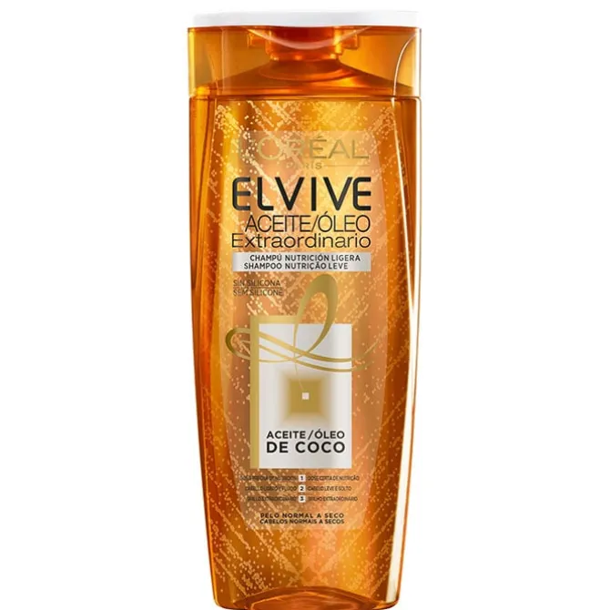 ACEITE EXTRAORDINARIO Aceite de Coco Champú de ELVIVE es un champú que aporta una ligera nutrición a las fibras capilares para un brillo infinito.