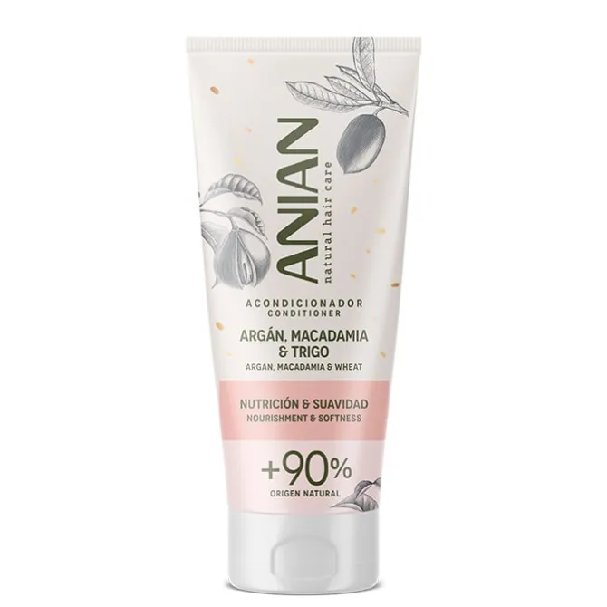 Acondicionador Argán, Macadamia & Trigo de Anian es un acondicionador nutritivo con aceite de argán, macadamia y trigo para el cabello seco y dañado.