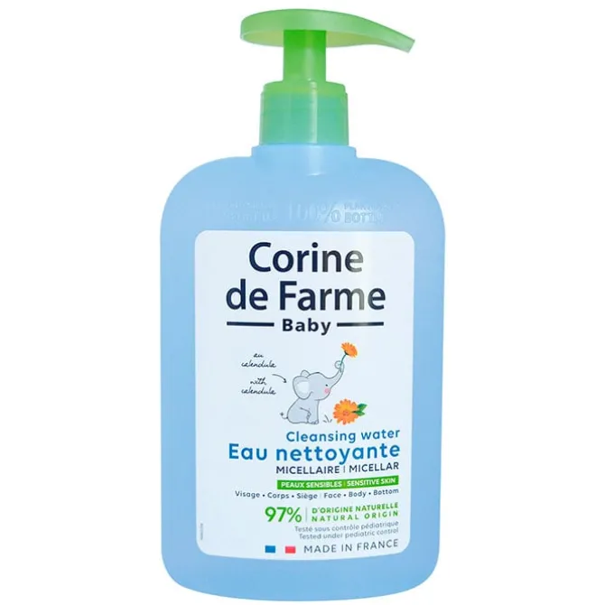 Agua Micelar Limpiadora de Corine de Farme es un agua limpiadora que elimina las impurezas de la piel del rostro, cuerpo y culito del bebé.