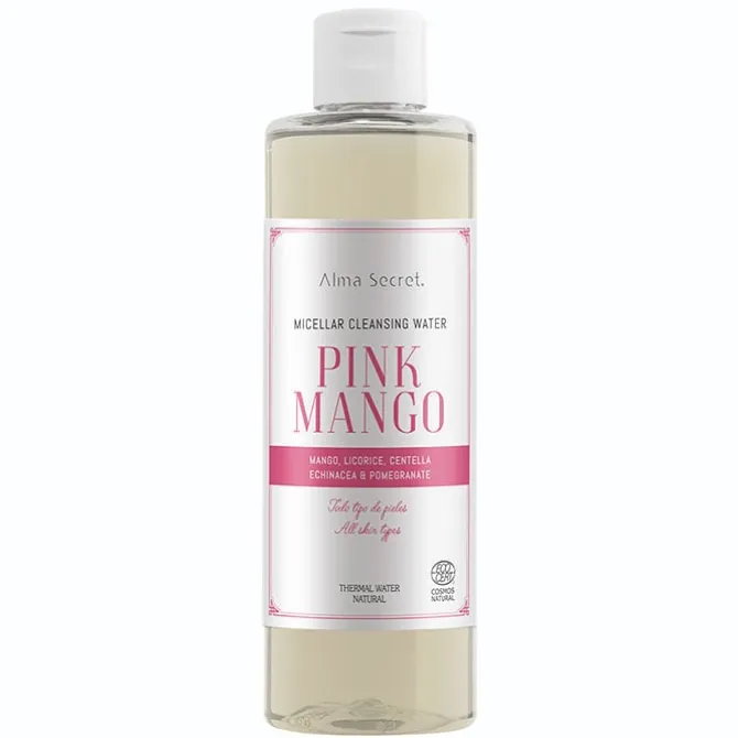 Agua Micelar Pink Mango de Alma Secret es un limpiador de impurezas y desmaquillador para rostro, ojos y labios.