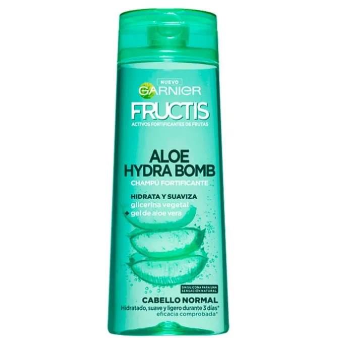 Aloe Hydra Bomb Champú de Fructis es un champú fortificante para cabello normal con glicerina vegetal y gel de aloe vera.