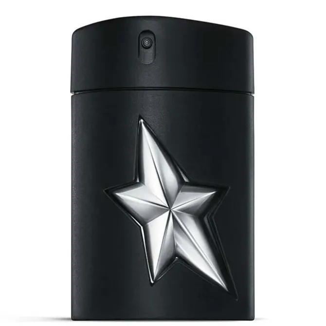 El frasco Mugler A*Men Fantasm Eau de Parfum se presenta adornado con la icónica estrella plateada de Mugler en color negro suave y táctil.