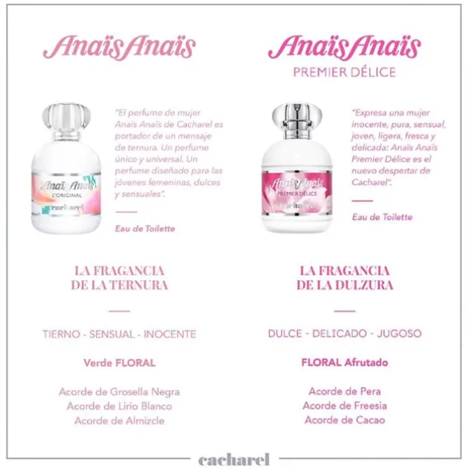 Anaïs Anaïs es el primer perfume de la firma Cacharel, el cual sigue siendo a día de hoy una apuesta segura en perfumes de mujer.