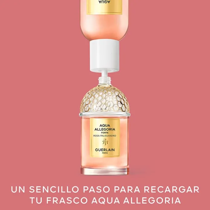 Guerlain presenta Aqua Allegoria Forte Rosa Palissandro con un sistema de recarga de 200 ml que amplía el ciclo de vida del frasco sin comprometer la calidad. El vaporizador se desenrosca manualmente para rellenar el frasco con un recambio fácil de usar, dotado de un sistema antiderrame que permite rellenar los frascos de 125 ml y 75 ml. No puede utilizarse sola, y es compatible exclusivamente con los frascos recargables de 125 ml y 75 ml. Es rellenable, reciclable y fabricado en Francia a partir de un 15 % de vidrio reciclado. Símbolo innegable del compromiso de Guerlain con el planeta, se componen de más de un 90 % de ingredientes de origen natural. El alcohol de remolacha francesa que se incluye en sus fórmulas procede de una cadena de suministro comprometida con la agricultura responsable.