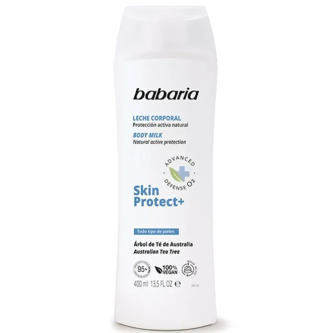 Esta leche hidratante protege eficazmente frente a los agentes externos gracias al 95% de activos naturales que contiencomo el extracto de árbol del té de Australia y vitamina E antioxidante. De textura ligera, no grasa, se absorbe fácilmente y proporciona intensa hidratación, suavidad y confort. Recomendada para todo tipo de piel, especialmente deshidratada o con tendencia seca. Como resultado del uso continuado de Babaria Body Milk Skin Protect + la piel luce elástica, fresca y sedosa.