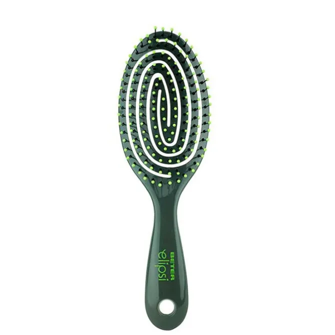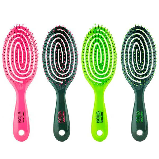 Su tamaño reducido permite llevarlo cómodamente a cualquier parte. Beter Cepillo Desenredante Elipsi Mini de cabezal flexible que se adapta al contorno de la cabeza incluye púas anti-enredos que evitan las roturas de las fibras capilares. Es perfecto para facilitar el cómodo peinado y secar la melena mediana y corta. Se desliza suavemente evitando los molestos tirones y la rotura de las fibras capilares, el peinado luce más saludable y radiante.