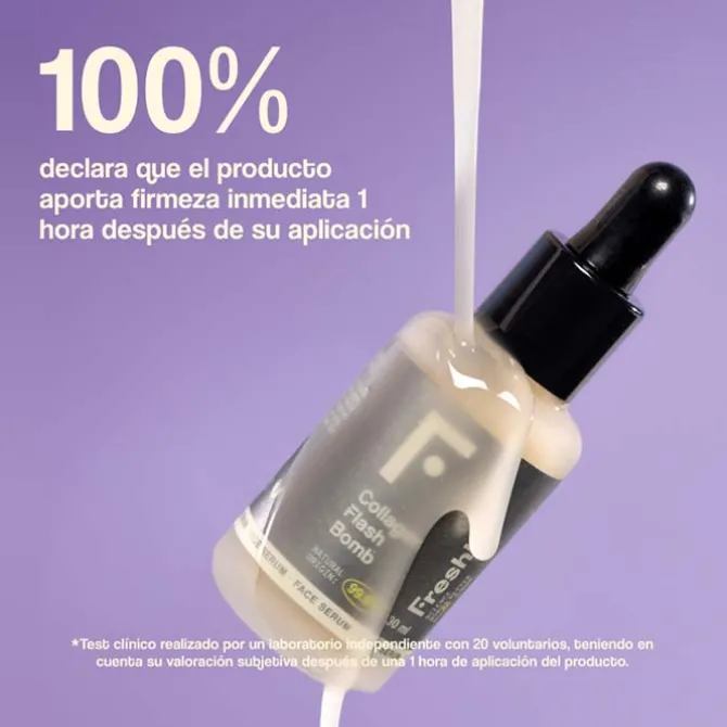 Contiene un aroma natural afrutado con notas verdes y acuosas, un corazón de pera y melón, y una base dulce de vainilla. De textura sérum ultrafluido se distribuye uniformemente y facilita su rápida absorción. Freshly Collagen Flash Bomb es apto para embarazadas y piel sensible, está indicado para renovar el metabolismo celular y aumentar su energía. Las líneas de expresión y arrugas se minimizan. El rostro luce rejuvenecido y saludable, más liso, denso y luminoso.