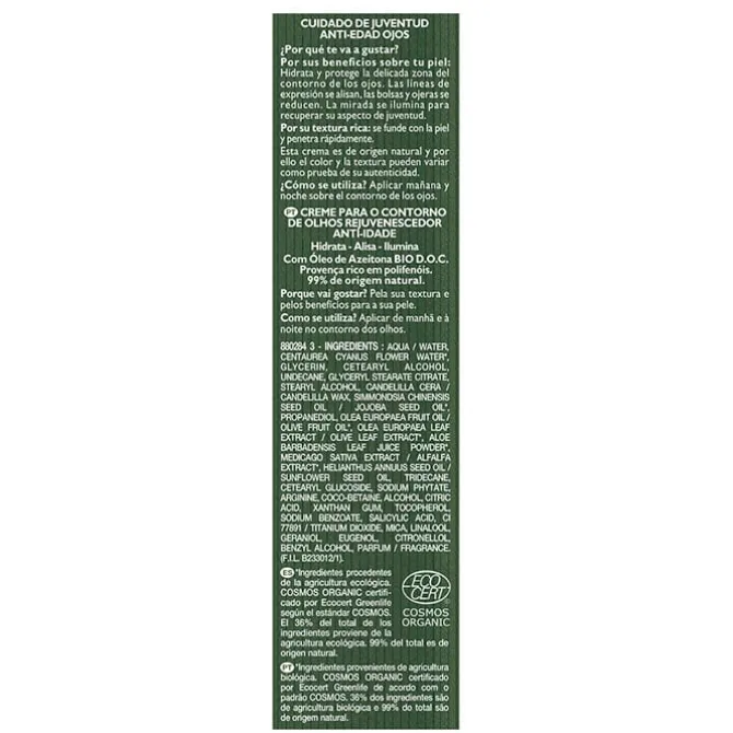 Este tratamiento intensivo hidrata la piel del contorno de los ojos y proporciona un tono homogéneo que difumina la ojera. Contiene flor de aciano que descongestiona la piel y aceite de oliva bio cultivado según los criterios de la agricultura ecológica sin utilizar productos químicos, pesticidas ni fertilizantes de síntesis. El aceite de oliva Bio de La Provencale se obtiene de manera artesanal, prensando en frío de inmediato tras la cosecha para proporcionar una elevada concentración de polifenoles antioxidantes.