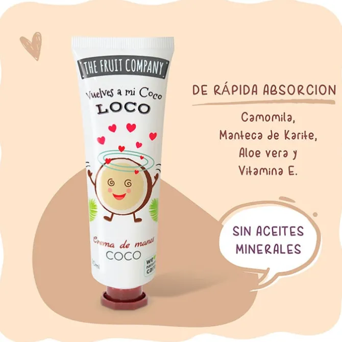 Crema de Manos Coco de Fruit Company es una crema de manos hidratante con manteca de karité, aloe vera, camomila y vitamina E.