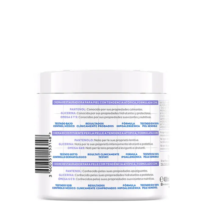Esta crema restauradora calma la piel al instante manteniendo la piel hidratada de rostro, cuerpo y manos. Es hipoalergénica, no contiene perfume y está formulada con un 13% Glicerina, Omega 6 y 9 y Pantenol, que ayudan a reducir los 4 signos de la piel con tendencia atópica: picor, rugosidad, sequedad y enrojecimiento. Ha sido testada bajo control dermatológico en 100% piel sensible con resultados clínicamente probados, lo que la convierte en una crema perfecta para cuidar y proteger las pieles delicadas.