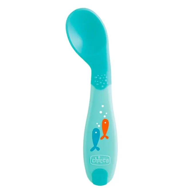 Cuchara Inclinada 8 Meses+ de Chicco es una cuchara suave con mango ergonómico para las primeras papillas