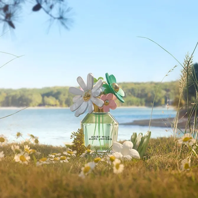 El frasco original de Marc & Jacobs Daisy Wild Eau es de vidrio transparente con líneas rectas, se tiñe en verde refrescante que refleja la vitalidad de la naturaleza. Se corona con un tapón el tapón floral con un ramillete depreciosas flores blancas y verdes, a modo de escultura, que ensalzan el frescor de la primavera silvestre.