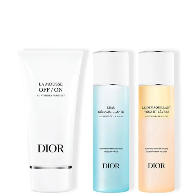 Descubra una selección de 3 productos de tratamiento limpiadores y desmaquillantes enriquecidos con nenúfar blanco francés de los jardines Dior: