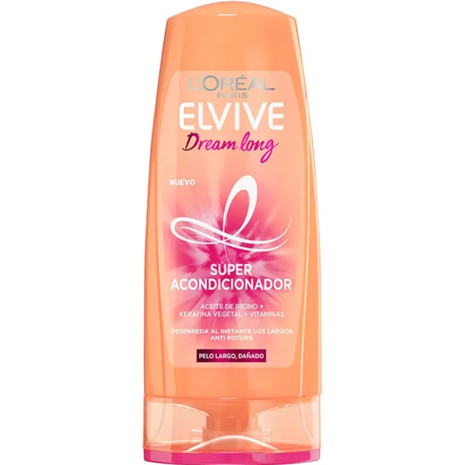 Este acondicionador restaura la firma capilar desde la raíz hasta las puntas gracias a la keratina vegetal y aceite de ricino que contiene su formulación. Está especialmente diseñado para evitar la rotura del pelo largo y dañado, facilita el desenredado y peinado al instante. Recomendado para evitar la rotura de cabellos largos y dañados. Con ELVIVE DREAM LONG Super Acondicionador se prolonga la vida del cabello, luce saludable, sedoso y brillante.