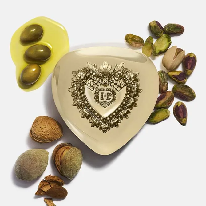 El estuche Evericon Eye Palette de Dolce & Gabbana tiene forma de corazón y viene en color dorado decorado con el icónico Sacro Cuore, e incluye un espejo integrado para una práctica aplicación en cualquier lugar.
