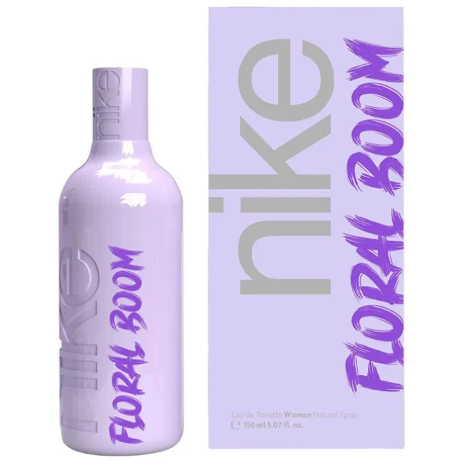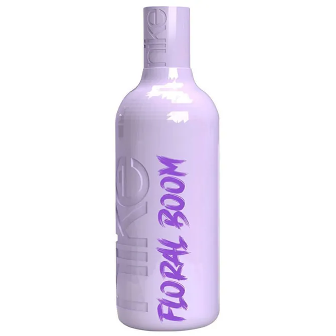 El frasco icónico de Nike Floral Boom Eau de Toilette se viste de gala para descubrirnos un diseño esférico y envolvente de líneas curvas que se tiñe de un color lila pálido que armoniza con el tapón que lo corona y contrasta con las letras de su nombre en un morado luminoso el a lo largo de él.