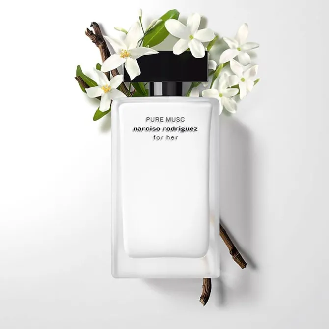 For Her Pure Musc de Narciso Rodríguez es un perfume femenino, distintivo y adictivo, mantiene en su fragancia el almizcle como base y se contrasta con un ramo de flores blancas y la cálida cachemira.