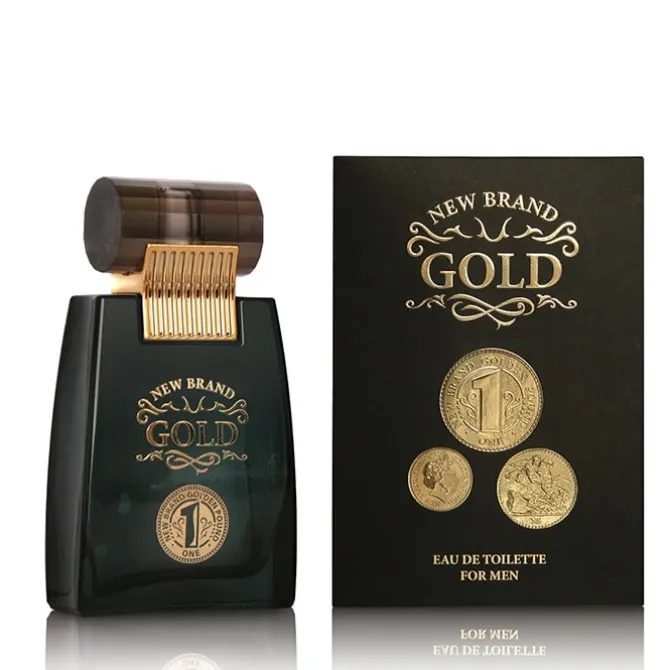 El frasco de New Brand Gold For Men Eau de Toilette vistoso y orinal en cristal negro intenso. Contrasta con el logo y nombre de la firma en letras y monedas doradas. Está coronado con un tapón negro que encaja mediante un artilugio dorado ostentoso que representa la abundancia, lujo y poder.