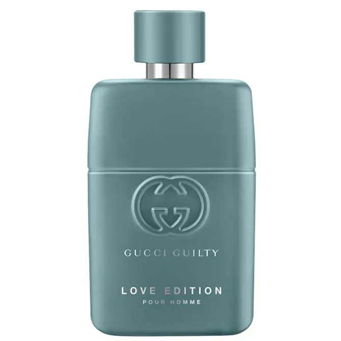 El frasco de Gucci Guilty Love Pour Homme Eau de Parfum de edición limitada presenta el emblemático logotipo de G entrelazado de la firma y un tapón plateado cepillado. El diseño se completa vestido en color verde almendra y representa la mitad de una maravillosa historia de amor.