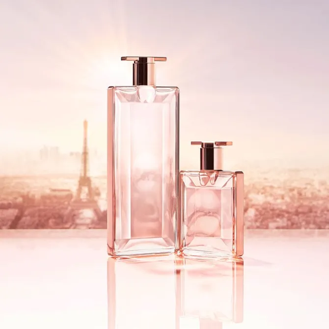 El innovador frasco, es el más fino del mundo. Con una silueta horizontal y fina de color rosa dorado, está coronado por un tapón moderno, elegante y sofisticado. IDÔLE de Lancôme, nosotros mismos somos nuestros propios ídolos. Además, su frasco es recargable.
