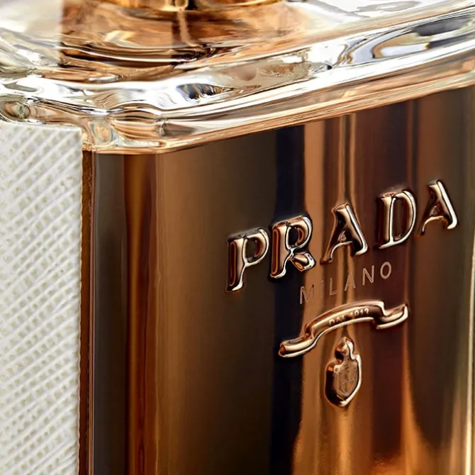 El frasco de La Femme Prada retoma el lenguaje clásico y distintivo de la firma. El blanco y dorado, se aplican a la fragancia femenina como un reflejo de su esencia sensual, mientras que el cristal ambarino subraya el exotismo del perfume. Además el diseño casi arquitectónico del frasco homenajea los interiores de Prada, que recuerdan al estilo de un joyero, el juego de espejos en su interior refleja la luz y multiplica las imágenes. La Femme Prada una evasión sensorial hacia la calidez del sol.