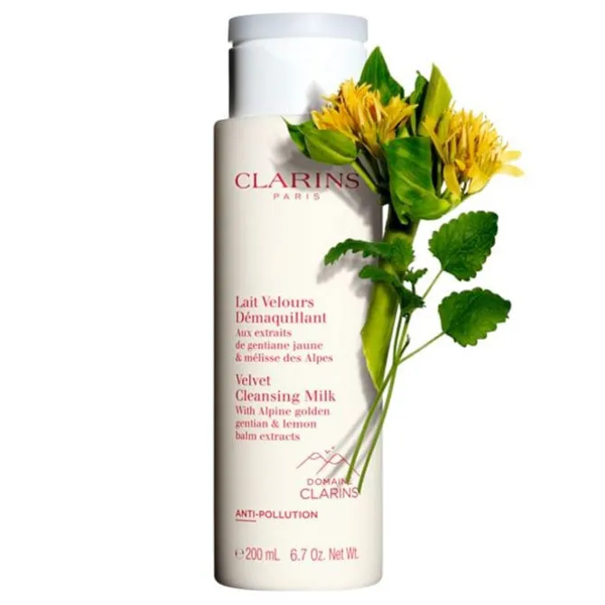Lait Velours Démaquillant de Clarins es una leche desmaquillante suave con extractos de genciana amarilla bio y melisa bio que eliminan suavemente las impurezas y maquillaje de todo tipo de piel proporcionando elasticidad y confort inmediato.