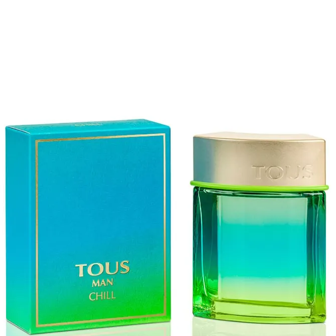El frasco de Tous Man Chill Eau de Toilette es líneas rectas como el resto de las fragancias de la colección Tous Man. Esta vez teñido en un degrado verde, azul y turquesa, coronado por un tapón dorado.