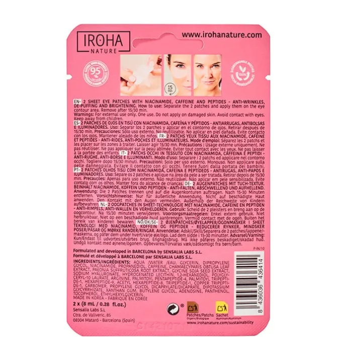 Testados clinicamente, con la garantía Clean Beauty se asegura la ausencia de ingredientes que podrían ocasionar algún daño en la piel y al medio ambiente, pues se generan a partir de materiales sostenibles. Es libre de siliconas, ciclicas, parabenos, sultados, duros, aceites minerales, ftalatos, fenoxietanol, etanolamidas, formaldehido, PEGS, acrilaros y plásticos… Como resultado de aplicar Iroha Nature Parches Ojos Cuidado Global con Niacinamida la piel del contorno de los ojos se mantiene visiblemente rejuvenecida, la mirada luce vital y radiante.