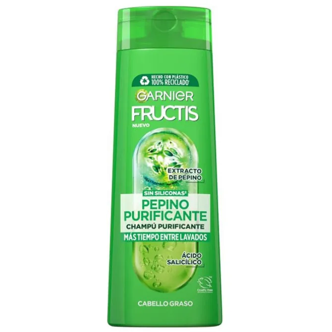 El champú de la línea Pepino Purificante de Fructis es fortificante. Su fórmula combina el extracto de pepino con agentes purificantes, que fortalecen la fibra capilar y purifican.