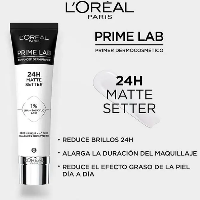 Su textura ligera y sedosa, se extiende suavemente y reduce visiblemente las líneas de expresión. L’Oréal Prime Lab 24H Matte Setter está indicado para mejorar intensamente la calidad de la piel, especiamente grasa y optimizar los resultados del maquillaje posterior. La piel luce suave, uniforme, sin brillos e impecable, el maquillaje logra un acabado profesional.