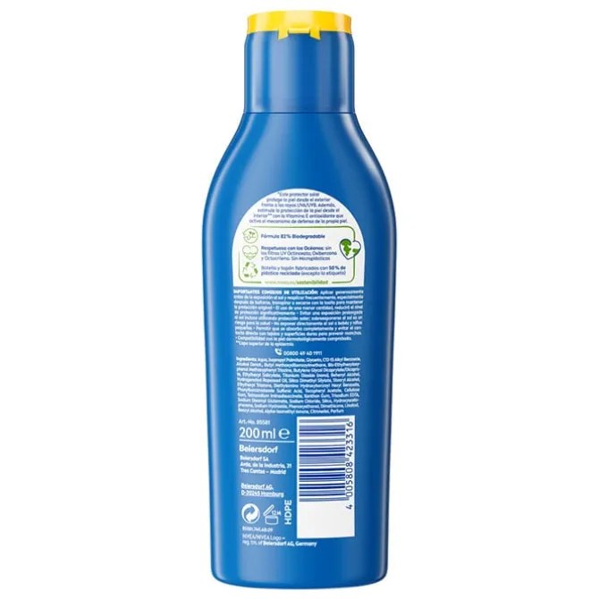 Se recomienda aplicar Protege & Hidrata Loción Solar SPF30 de Nivea Sun y repartir hasta su completa absorción. Para garantizar una eficaz protección, repetir el proceso con frecuencia, especialmente tras el baño, secado y transpiración.