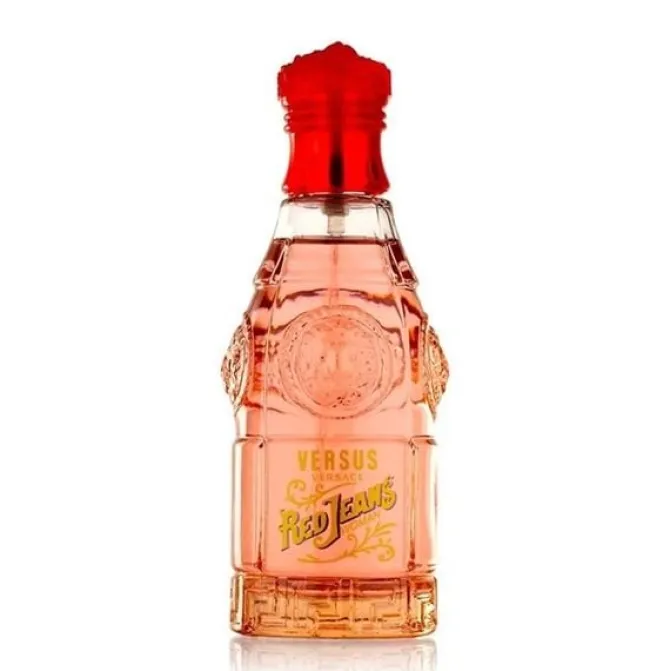 El frasco de Versace Red Jeans Eau de Toilette refleja una botella antigua de refresco, un vidrio transparente que deja ver a la perfección su jugo rojo-anaranjado.