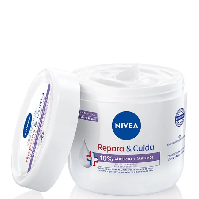 Repara & Cuida Glicerina + Pantenol de Niveaes una crema hidratante y sin perfume para rostro, manos y cuerpo.