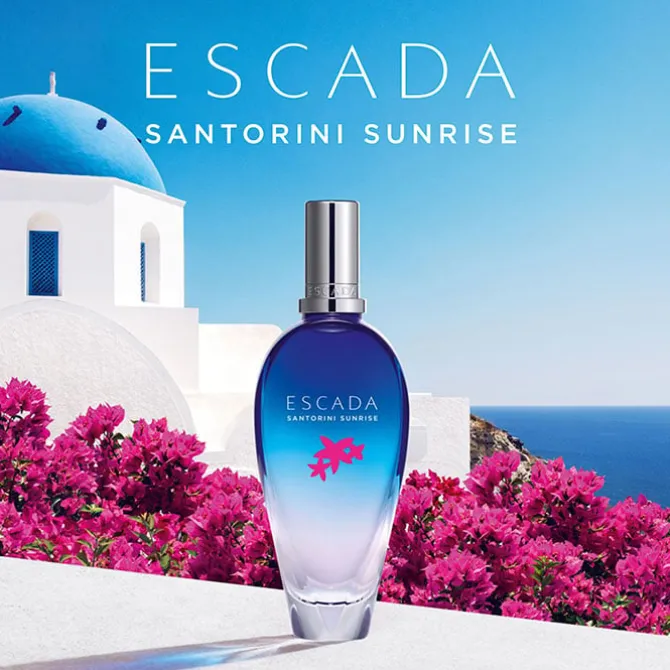 El frasco de Santorini Sunrise de Escada se inspira en las profundas olas del océano contrastadas por las femeninas flores de buganvilla y en su packaging, la arquitectura de los pueblos de la isla durante un amanecer.