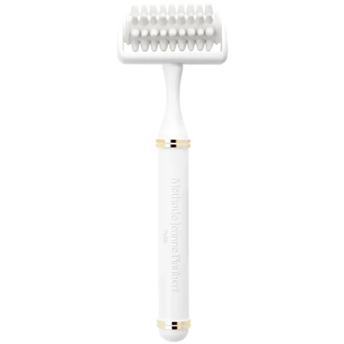 Stimuloval de Jeanne Piaubert es un aparato de masaje para rostro y cuello con puntas cónicas suaves de elastómero flexible que ejercen una presión puntiaguda y alterna para activar los tejidos perpendiculares a la superficie de la piel. Su sistema de rotación ofrece un masaje profundo sin dañar.