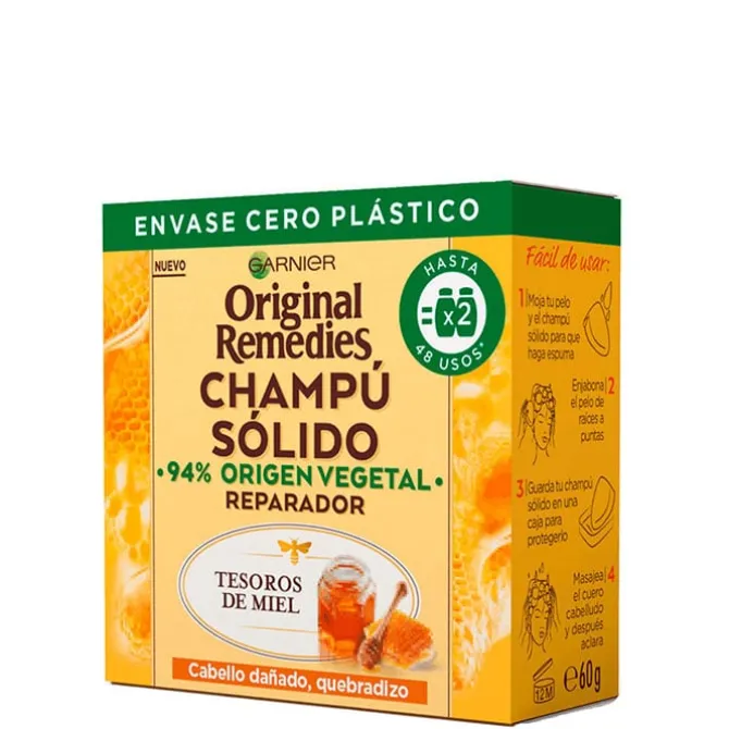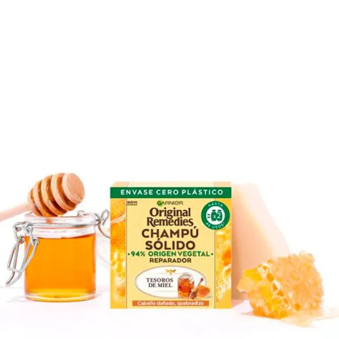 Los champús sólidos de Garnier contienen ingredientes en un 94% de origen vegetal, como la miel de abastecimiento responsable y la cera de abeja ecológica. La formulación y el cartón que lo envuelve son 97% biodegradables, además no contiene jabón ni conservantes ni siliconas. Testado dermatológicamente.