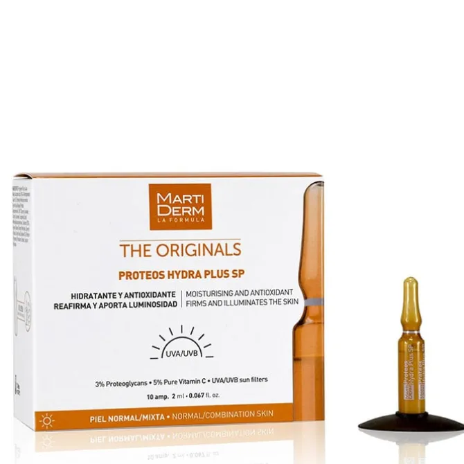 THE ORIGINALS Proteos Hydra Plus SP de Martiderm son ampollas antioxidantes para pile mixta/grasa que hidratan, reafirman, iluminan y reducen las arrugas.