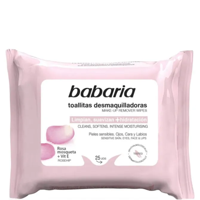 Toallitas Desmaquilladoras Rosa Mosqueta de Babaria son unas toallitas desmaquillantes para ojos, cara y labios enriquecidas con vitamina E.