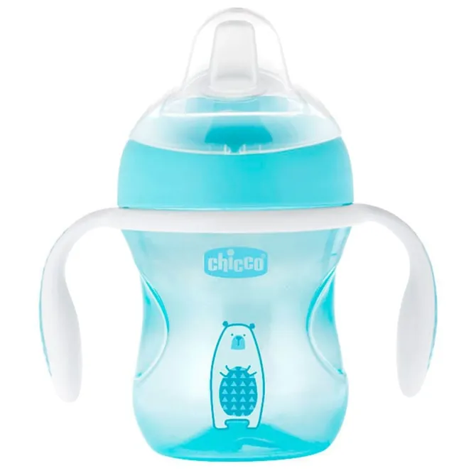 Vaso de Transición Mix&Match Azul 4 Meses+ de Chicco es un vaso ergonómico con asas y tetina de silicona suave y flexible.