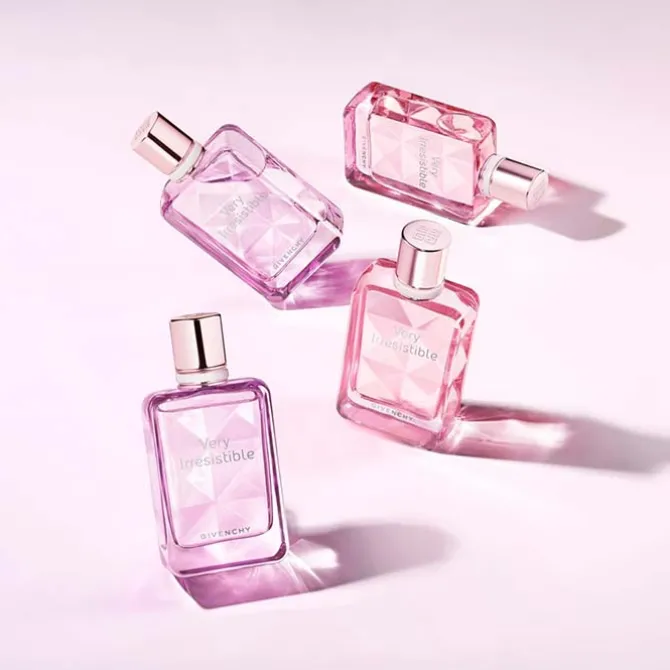 El frasco Very Irrésistible EDT se presenta rediseñado con las líneas ultrafemeninas y facetadas, que abrazan la sofisticación contrastada con la frescura de la laca rosa caramelo, uno de los colores favoritos de Hubert de Givenchy.